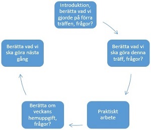 Varje träff är uppdelad på två 45-minuters pass med en halvtimmes rast/fika emellan. Det går självklart bra att lägga till ytterligare tid, men det är något som är individuellt från grupp till grupp och det gäller att anpassa sig efter det. Studiecirkeln består av tio stycken träffar, där de inledande fyra gäller skapandet av en fysisk kommunikationsbok och de resterande sex träffarna ägnas åt skapandet och undervisningen i kommunikationsapplikationen. Studiecirkeln kan komma att kräva en uppföljning eller en fortsättningscirkel, men återigen är det deltagarnas behov som avgör detta.